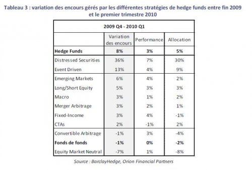 avec en tête les stratégies Event Driven et Distressed Securities. A contrario, les fonds de fonds ferment la marche avec les Convertible Arbitrage qui avaient été les plus fortement affectés par la crise et les Equity Market Neutral qui n’ont pas bénéficié de la très forte reprise des marchés en 2009.