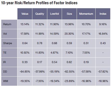 Momentum is a well-documented tendency for persistence in stocks’ price returns: stocks that have recently outperformed tend to continue to do so for some time. The low volatility factor is a return stream associated with less risky stocks and the quality factor represents the performance of a subset of more defensive stocks.