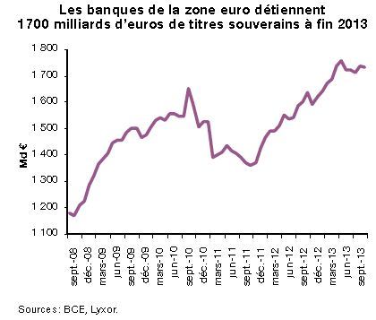 Elles doivent donc détenir en permanence un stock d’actifs liquides et de qualité (HQLA [2]) au premier rang desquels les emprunts d’État. Selon les chiffres de la BCE, les banques européennes ont augmenté leur détention de titres souverains de 550 milliards depuis 2008 à 1 700 milliards d’euros fin 2013.