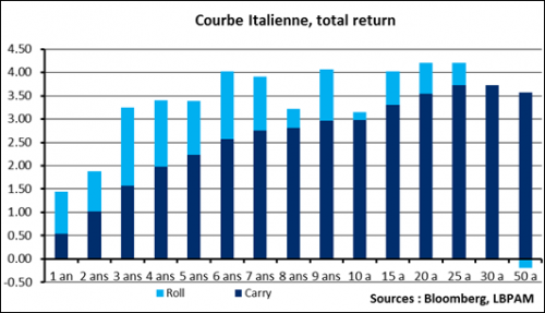 L’analyse est aussi validée si on prend en compte non seulement le « carry » (le rendement affiché) des obligations mais aussi leur « roll » (le fait qu’en diminuant leur durée de vie elles se renchérissent). Le graphique ci-dessous montre que la partie courte de la courbe italienne offre un rendement copieux par rapport à la courbe allemande, mais c’est au-delà de 3 ans et surtout sur la partie après 6-ans que les rendements sont très élevés.