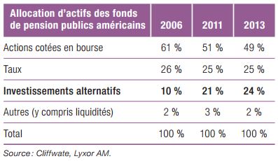 Le tableau ci-dessous montre comment la part de la gestion alternative dans l’allocation stratégique des fonds de pension américains a plus que doublé depuis la crise.