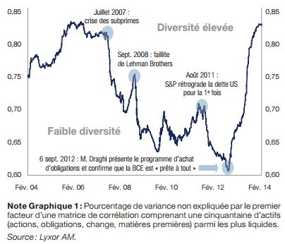 On observe que la diversité des marchés s’est dégradée par paliers à partir de la crise des sub-prime, puis de la faillite de la banque Lehman Brothers et enfin lors de la crise de l’euro. En pratique, cette baisse de la diversité s’est traduite par une corrélation très élevée en valeur absolue.