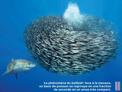 La plupart des poissons se déplacent “en banc”, nageant de façon autonome mais toujours interconnectés. Lorsqu’ils se sentent menacés, un phénomène inhabituel se produit chez certaines espèces : en une fraction de seconde, le banc se regroupe en un amas très compact. Les milliers d’individus qui le constituent se mettent alors à nager de façon parfaitement coordonnée et créent un amas appelé baitball. Celui-ci peut prendre atteint des proportions impressionnantes, certains atteignant plusieurs dizaines de mètres de rayon.
