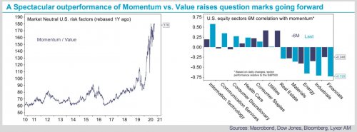 Ces derniers mois, le facteur de risque Momentum a généré des performances robustes, en particulier aux États-Unis (+7,7% au troisième trimestre 2020). En ce moment, ses positions longues concernent les technologies de l’information, la consommation discrétionnaire et de nombreux secteurs défensifs (services de communication, consommation de base, soins de santé), ce qui reflète l’incertitude actuelle entourant la croissance. Parallèlement, ce facteur est négativement corrélé aux performances de la finance et de l’énergie. S’agissant de sa corrélation avec d’autres facteurs de risque, il s’avère que depuis quelque temps, l’approche Momentum équivaut à celle du Low Beta. En outre, elle est de plus en plus vulnérable à la hausse des rendements obligataires : selon nos estimations, un accroissement de 10 pb des taux longs américains freinerait de 2,4% la performance du style Momentum.