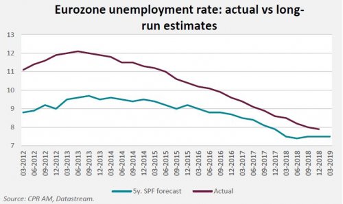 In the euro area, labor market conditions are improving, but full employment is not yet achieved. On the top of that, large disparities remain between the Eurozone countries and total underemployment, ie labour market slack other than unemployment, remains significant (involuntary part-time work, people too discouraged to look for a job, etc.). If it follows its H2 2018 pace, the unemployment rate in the euro zone (7.9% in December) should reach around 7.5% at the end of 2019, which will correspond with the long-term unemployment rate estimated by professional forecasters [2]. Reaching the long-term unemployment level may allow the ECB to show more confidence in the inflation outlook.