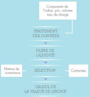 un processus de sélection qui détermine le choix des valeurs et leur poids dans le portefeuille. Le portefeuille est réajusté chaque mois (selon le schéma ci-dessous) en fonction de l’évolution des volatilités et des corrélations des valeurs les plus liquides de l’univers d’investissement.
